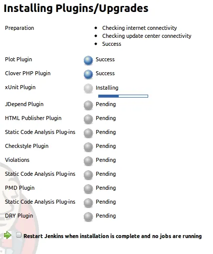 sudo service jenkins restartTake a look at the last line, if you want to install additional plugins you have to restart your Jenkins server for making it available. ## Installing the PHP Quality Assurance Toolchain The most common required PHP tools should be installed using the PEAR Installer, the backbone of the PHP Extension and Application Repository that provides a distribution system for PHP packages. Now this point could differ depending in tools you use in your build script. For example if you use Behat you have to install it with PEAR before build the project, and so on. The following commands are all that is required to install the required PHP tools using the PEAR Installer: